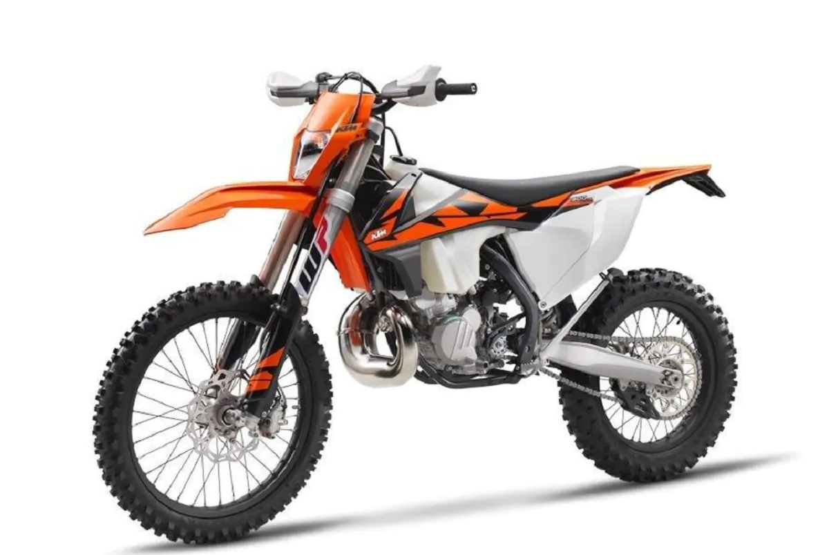 KTM EXC ha un motore a due tempi di 249 cc con raffreddamento a liquido e avviamento elettrico.
