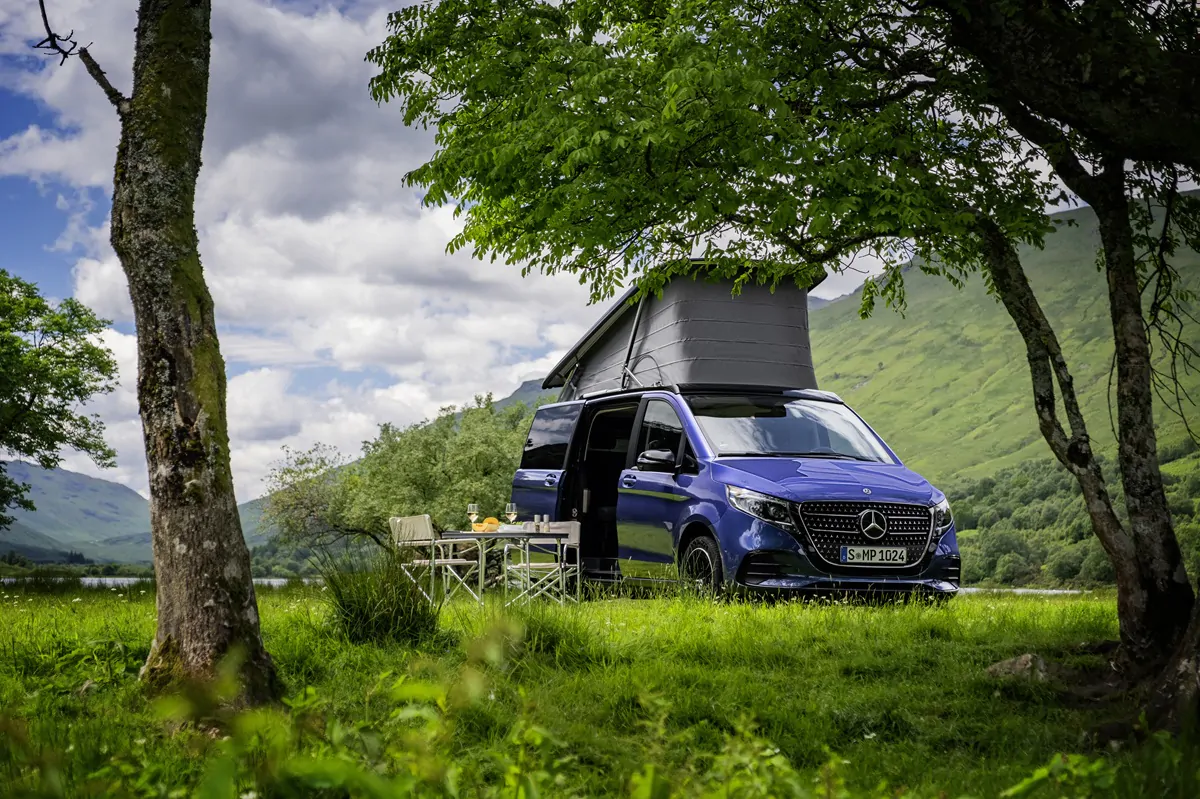 Fotoproduktion Schottland 2024: Die neue Mercedes-Benz V-Klasse Marco Polo – AMG Line, Sodalithblau metallic, MBUX Multimediasystem, Widescreen Cockpit, Polster Leder Lugano schwarz, Camper-Umfänge u.a. Kleiderschrank, Küchenzeile mit Klapptisch, Drehbare Fahrer- und Beifahrersitze, Sitzliegebank, Aufstelldach mit Dachbett, MBAC Camper-Bedieneinheit Pictures taken in Scotland 2024: The new Mercedes-Benz V-Class Marco Polo – AMG Line, Sodalith blue metallic, MBUX Multimediasystem, Widescreen Cockpit, Black Lugano leather upholstery, Camping features include among others Wardrobe, Kitchenette with folding table, Swivel driver and passenger seats, Bench seat/reclining bench, Pop-up roof with roof bed, MBAC camper control unit