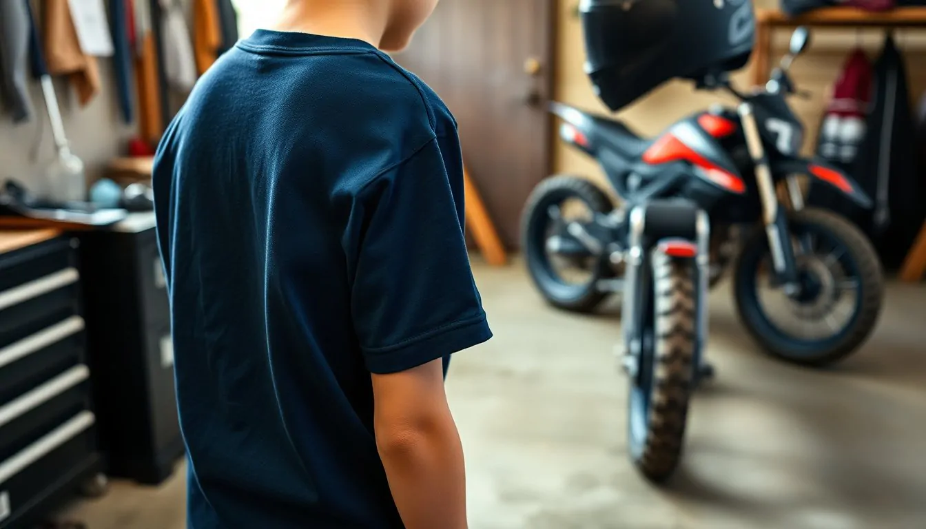 Questa proposta è pensata per i giovani appassionati di motociclismo: una t-shirt in cotone dal colore blu navy che unisce comfort e un look grintoso.