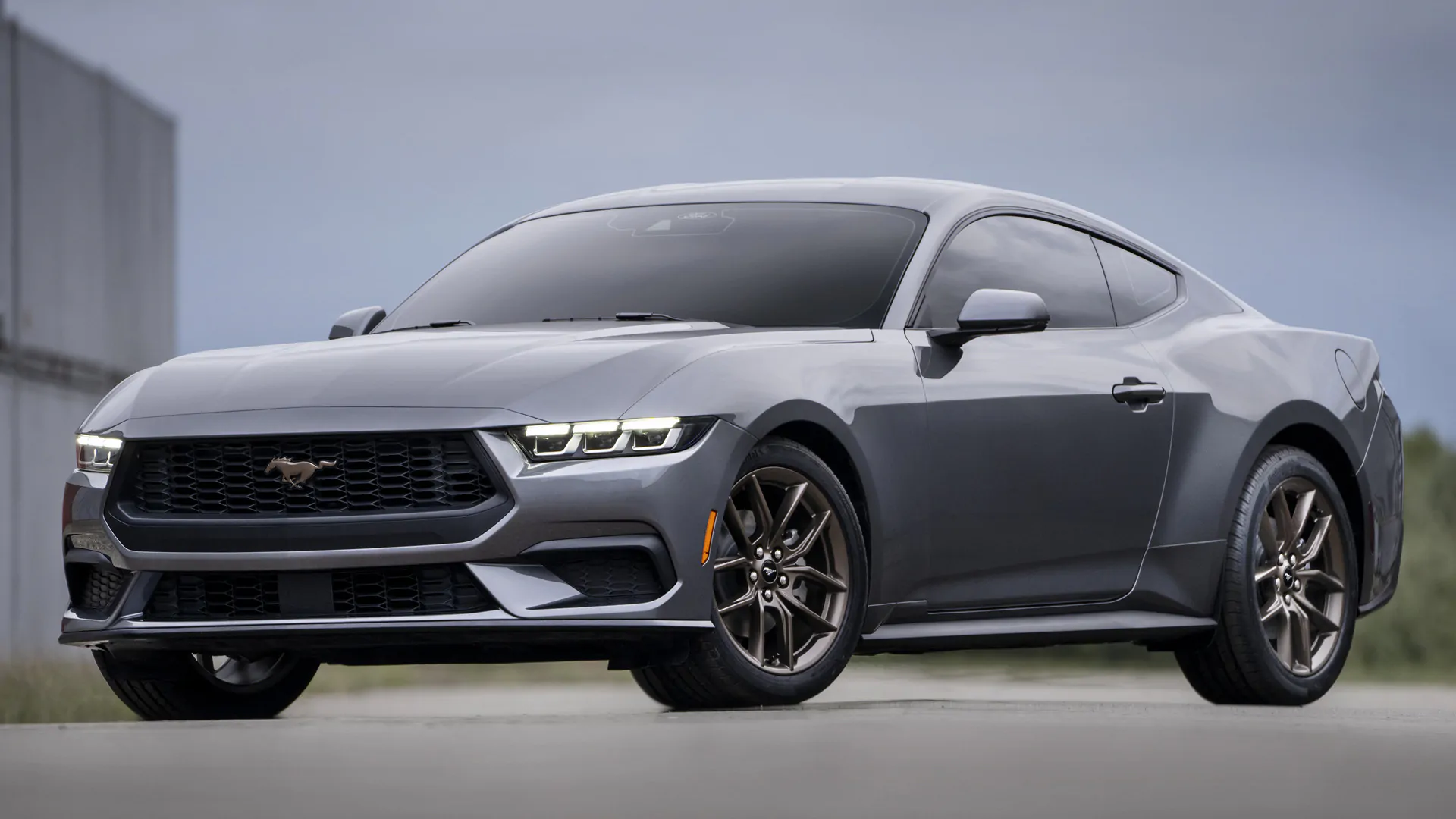 Le profonde fiancate e gli ampi parafanghi della nuova Mustang, combinati con le ruote esageratamente grandi di questo studio 2D, conferiscono all’auto proporzioni muscolose.