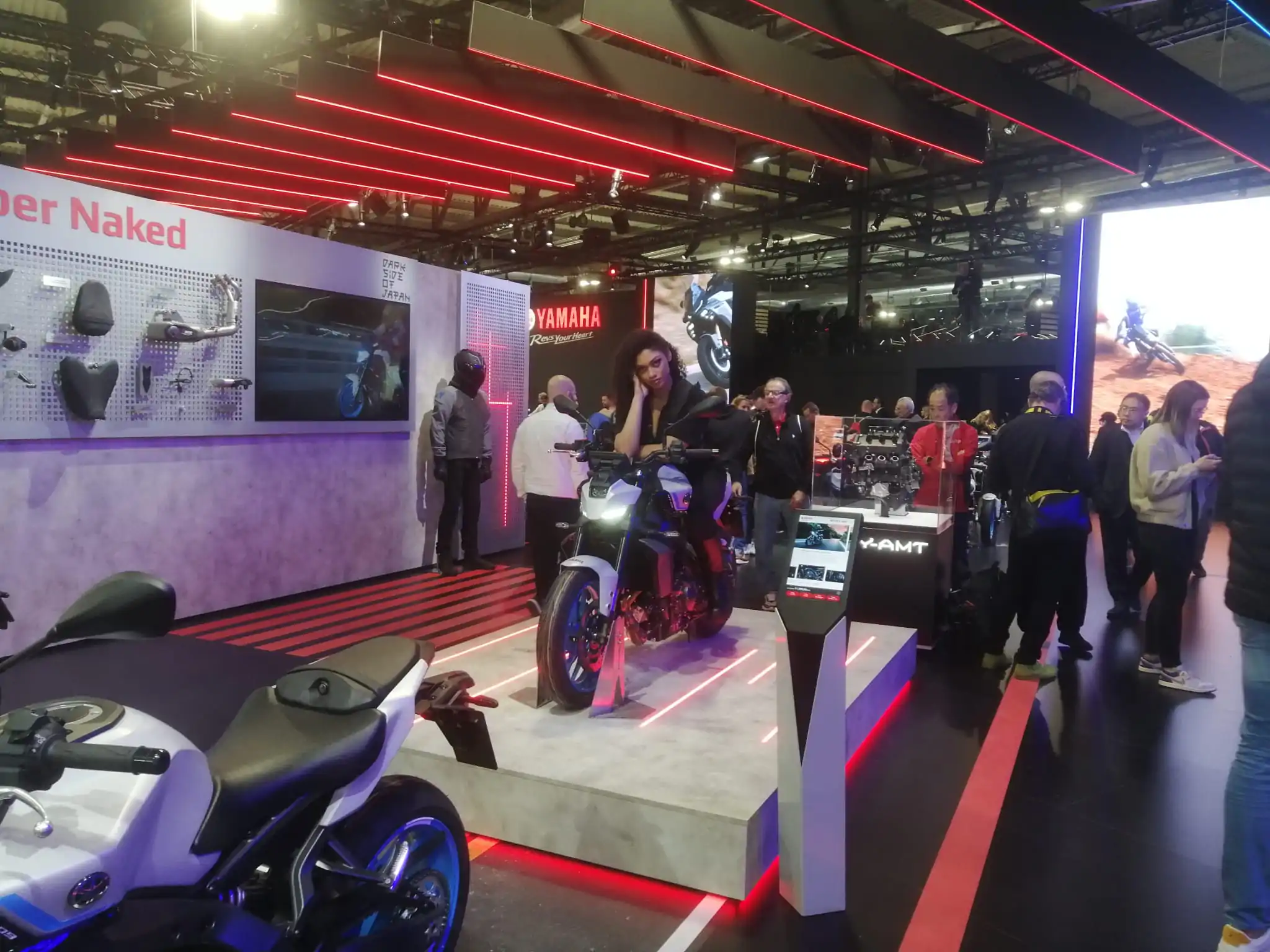 La Yamaha MT09 colpisce appena si accede allo stand della casa giapponese, sia perché è posizionata al centro ma anche perché conosciamo quelle che sono le sue prestazioni, abbiamo già avuto modo di incontrarla tramite la brochure stampa, ma vederla dal vivo, come sempre, fa tutto un altro effetto.